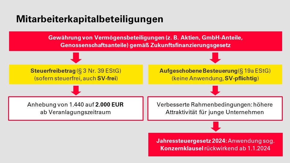Das Gesetz zur Finanzierung von zukunftssichernden Investitionen (Zukunftsfinanzierungsgesetz – ZuFinG) wurde am 14. Dezember 2023 im Bundesgesetzblatt veröffentlicht. Neben finanzmarktrechtlichen Anpassungen und der Fortentwicklung des Gesellschaftsrechts sind auch steuerrechtliche Rahmenbedingungen für Mitarbeiterkapitalbeteiligungen (im Einkommensteuergesetz als „Vermögensbeteiligungen“ bezeichnet) verbessert worden.