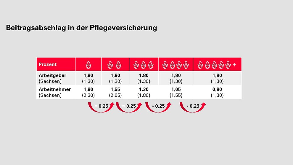 Für Arbeitnehmer mit Elterneigenschaft reduziert sich der Beitragssatz zur Pflegeversicherung für jedes berücksichtigungsfähige Kind ab dem zweiten Kind bis zum fünften Kind um jeweils einen Beitragsabschlag in Höhe von 0,25 Beitragssatzpunkten: