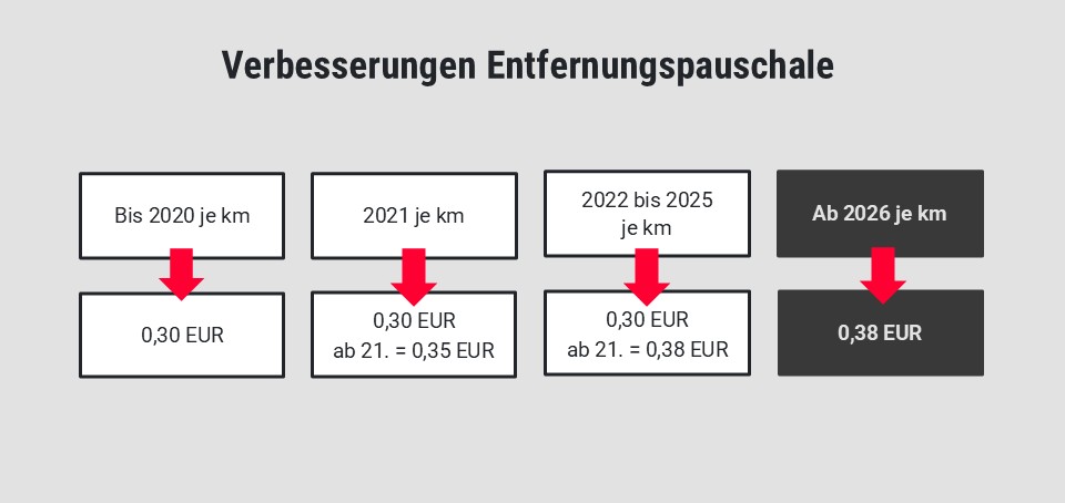 Mit dem Steueränderungsgesetz 2025 ist dieser Plan nun in die Tat umgesetzt und die Entfernungspauschale zum 1. Januar 2026 einheitlich auf 38 Cent ab dem ersten gefahrenen Kilometer erhöht worden; bisher galt dieser Betrag erst ab dem 21. Kilometer. Das Bundeskabinett hat das Steueränderungsgesetz 2025 am 10. September 2025 beschlossen, der Bundestag hat es am 4. Dezember 2025 in 2./3. Lesung verabschiedet und der Bundesrat hat am 19. Dezember 2025 zugestimmt. Die Veröffentlichung im Bundesgesetzblatt erfolgte am 23. Dezember 2025 (Nummer 363).