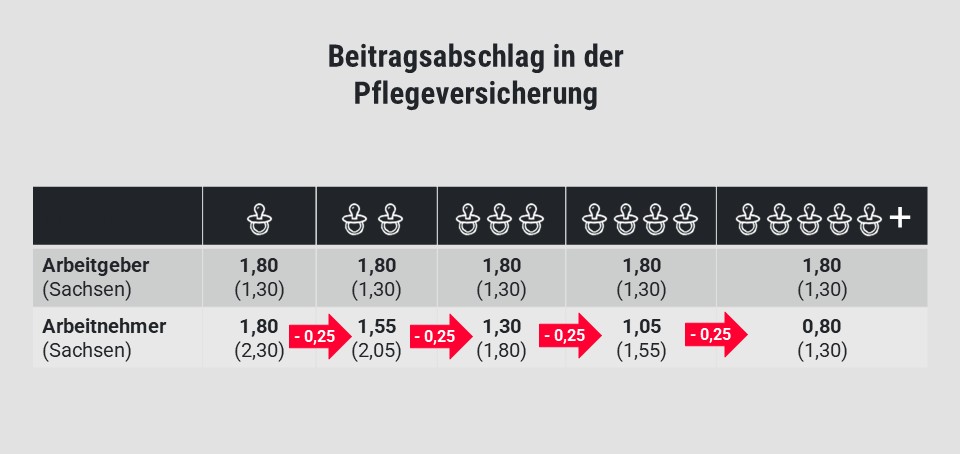 Für Arbeitnehmer (und Versorgungsbezieher) mit Elterneigenschaft reduziert sich der Beitragssatz zur Pflegeversicherung für jedes berücksichtigungsfähige Kind ab dem zweiten Kind bis zum fünften Kind um jeweils einen Beitragsabschlag in Höhe von 0,25 Beitragssatzpunkten. Der Beitragsabschlag für Eltern beträgt somit
