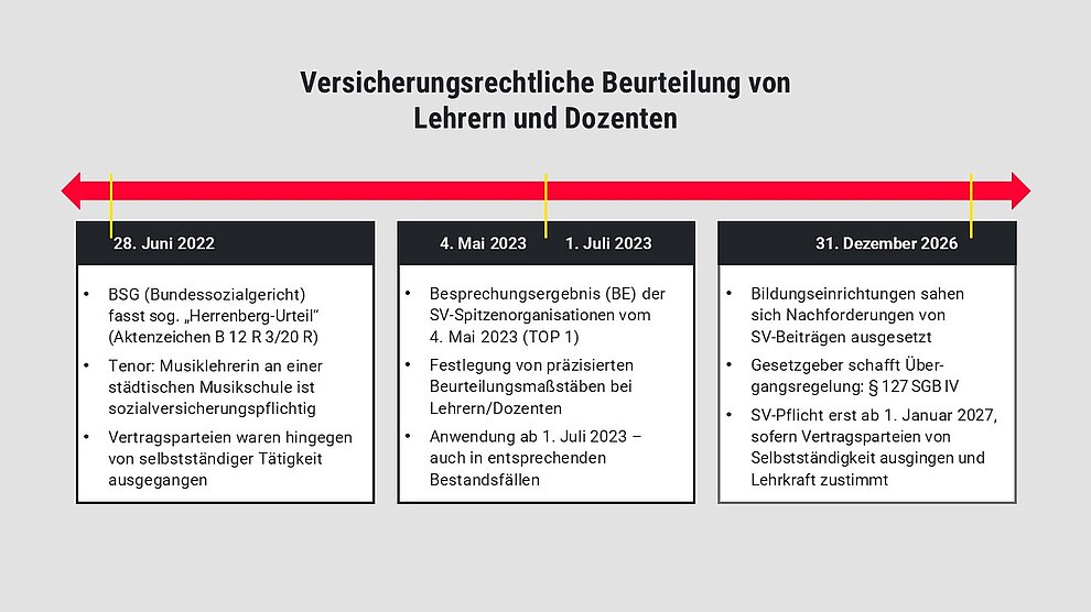 Nach der Übergangsregelung in § 127 SGB IV soll eine Feststellung des Sozialversicherungsstatus von Lehrkräften als abhängig beschäftigt durch die Sozialversicherungsträger bis zum 31. Dezember 2026 ohne Wirkung bleiben; d. h. die Versicherungspflicht soll erst ab dem 1. Januar 2027 beginnen. Dies gilt immer dann, wenn